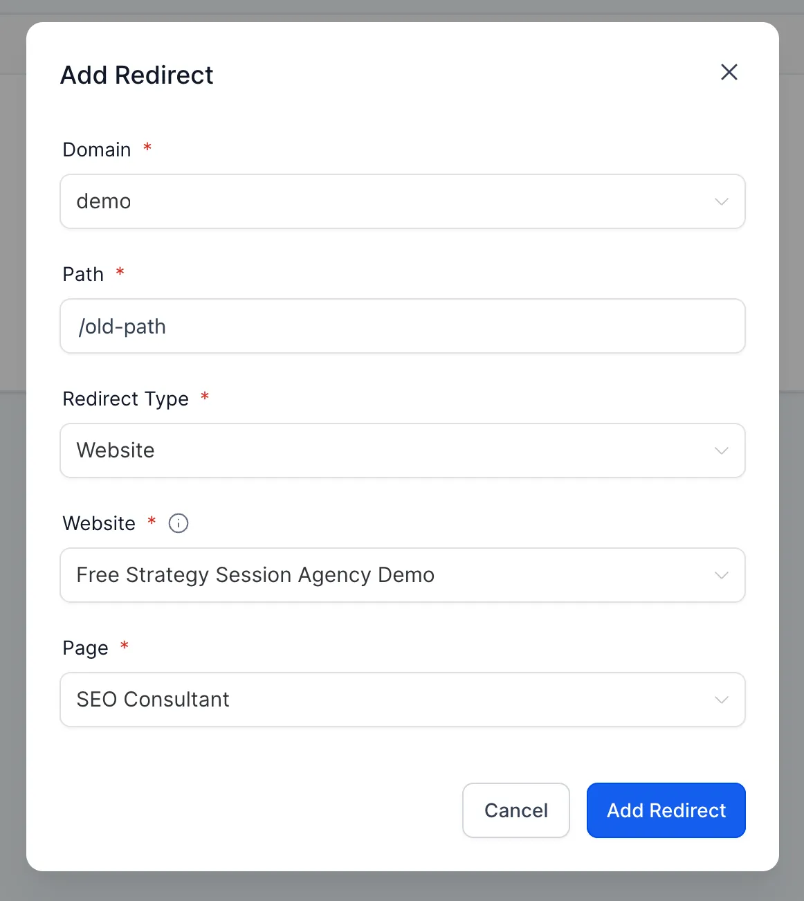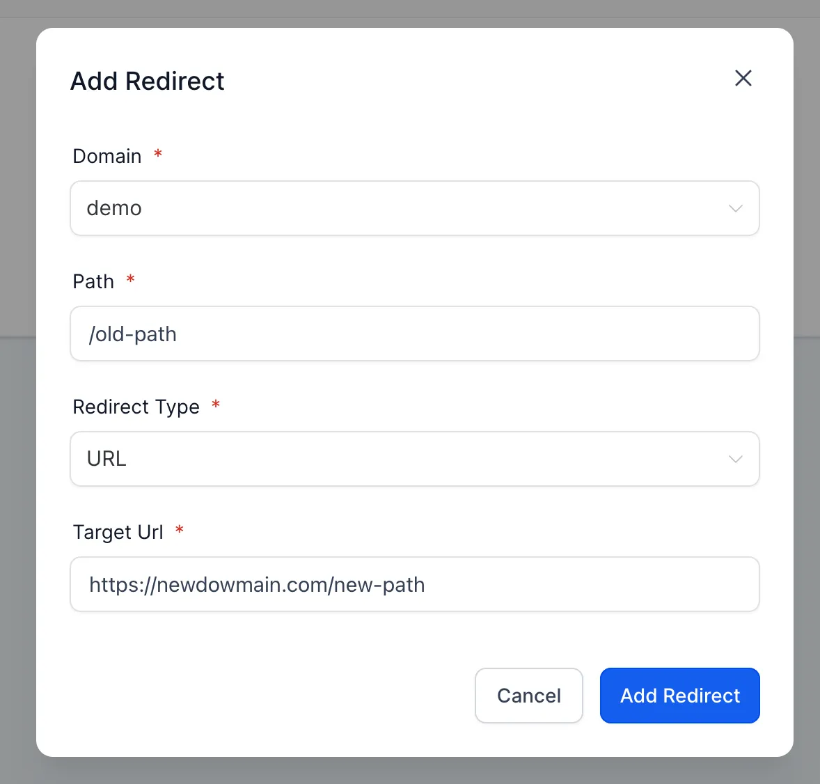 Das Domain, von der Sie umleiten, muss bereits Ihrem pilotly.io-Unterkonto hinzugefügt worden sein. Im Feld "Pfad" folgen Sie dem Platzhalter Beispiel, einschließlich eines "/" im Feld, direkt gefolgt vom neuen Pfad nach dem "/". Die "Ziel-URL" muss eine vollständige, gültige URL sein.
