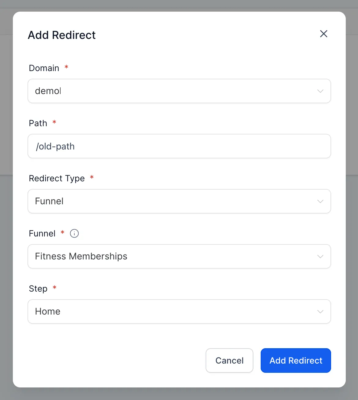 Die Funnel-Weiterleitung ermöglicht es Ihnen, eine URL mit einer 301-Weiterleitung zu einem Schritt in einem bestehenden Funnel umzuleiten, der mit einer Domain innerhalb des Unteraccounts verknüpft ist.