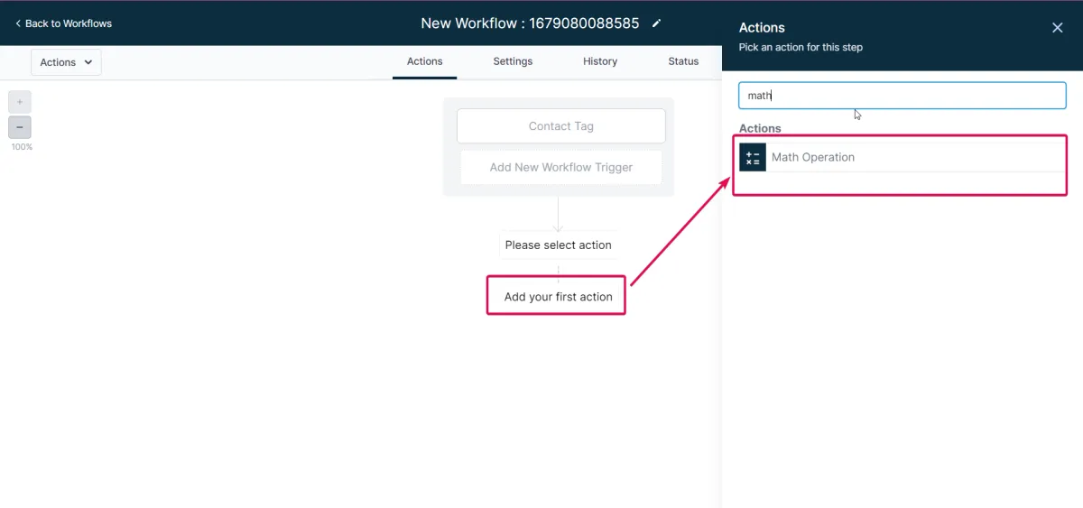 1. Erstellen oder Auswählen eines Workflows: Beginnen Sie damit, einen neuen Workflow zu erstellen oder einen bestehenden auszuwählen, auf den Sie die Mathematik-Operationsaktion anwenden möchten.