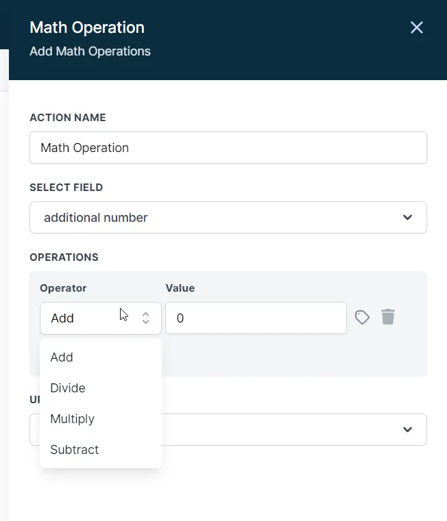 5. Geben Sie den Operator ein. Geben Sie den Wert oder das benutzerdefinierte Feld ein, das als Operator in der mathematischen Operation verwendet werden soll. Wenn Sie beispielsweise 10 zu einem numerischen Feld hinzufügen möchten, geben Sie "10" ein. Wenn Sie ein benutzerdefiniertes Feld verwenden, können Sie es mit den entsprechenden Merge-Tags oder der benutzerdefinierten Feldsyntax einfügen.