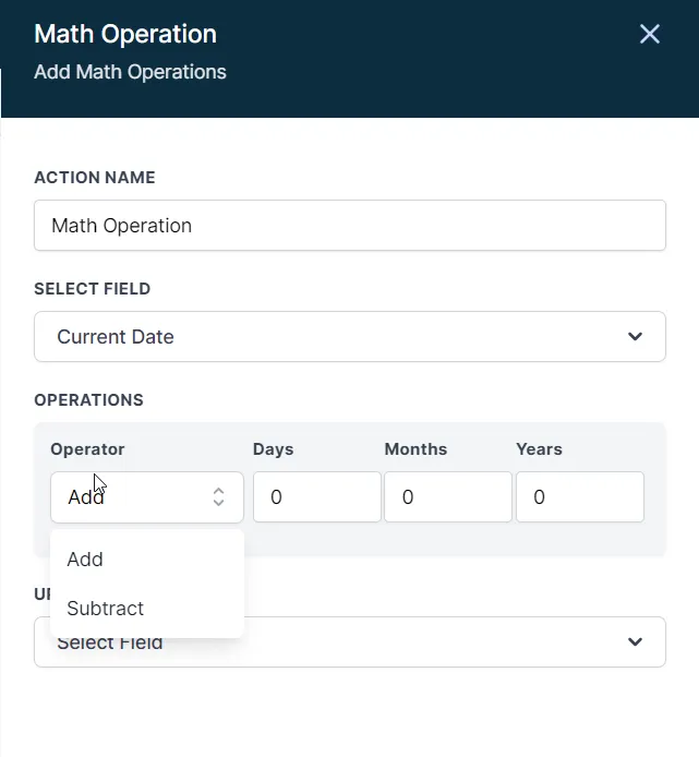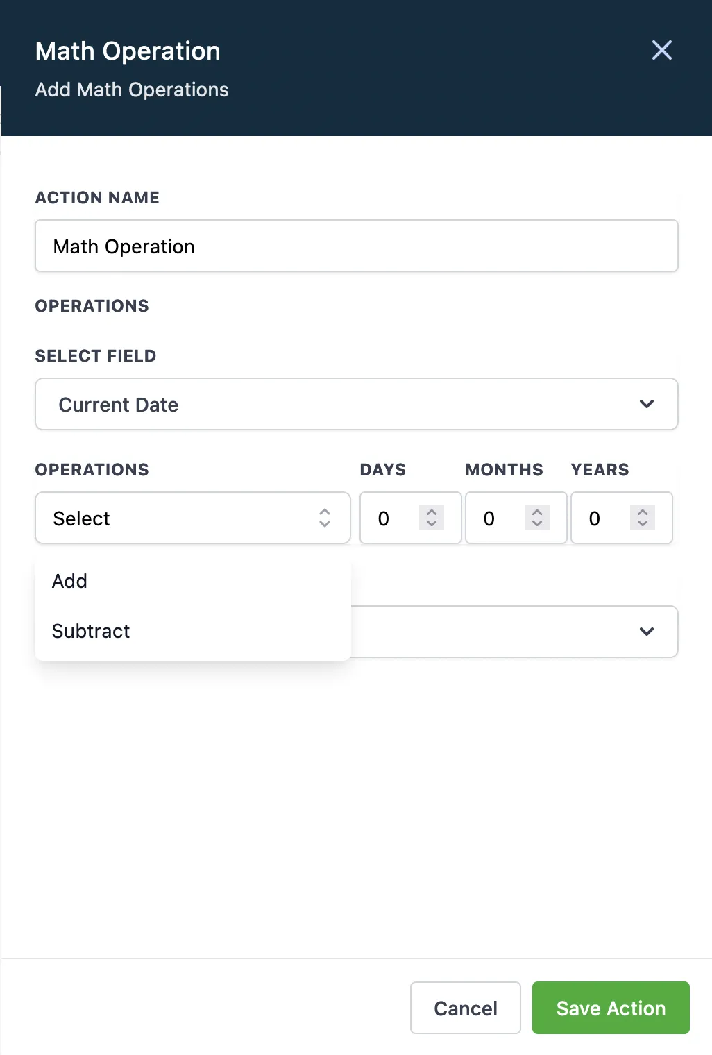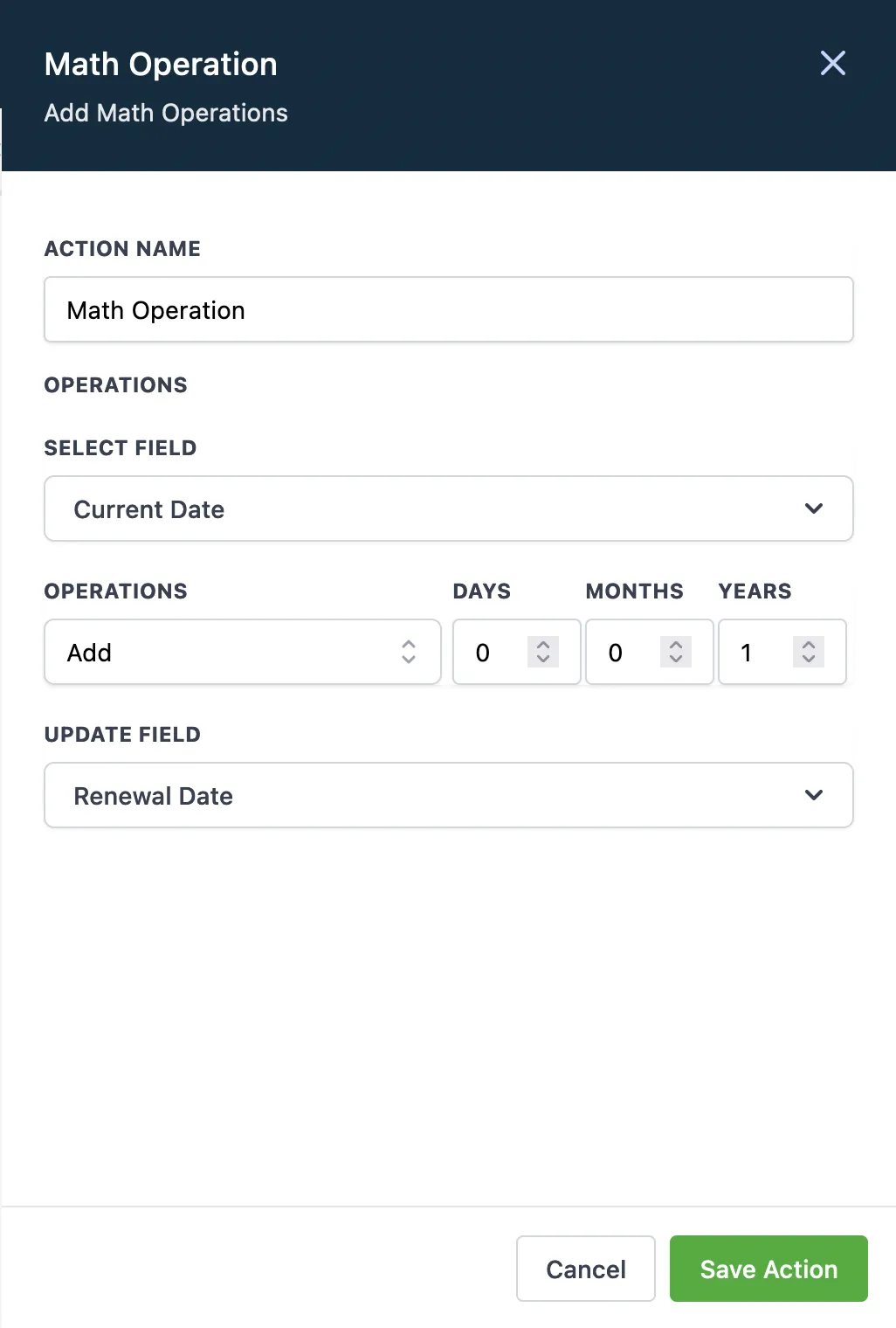Die Math Operation-Aktion in Workflows ist ein mächtiges Werkzeug, das Berechnungen und Manipulationen an numerischen und Datumsfeldern automatisiert und Geschäftsprozesse sowie Entscheidungsfindungen strafft. Stellen Sie sich zum Beispiel ein Fitnessstudio vor, das automatisch das Erneuerungsdatum seiner Mitglieder aktualisieren möchte, indem es ein Jahr zum aktuellen Ablaufdatum der Mitgliedschaft hinzufügt. Mit der Math Operation-Aktion kann das Fitnessstudio mühelos einen Workflow einrichten, um diese Berechnung durchzuführen, wodurch Zeit gespart und Genauigkeit gewährleistet wird, während es sich darauf konzentriert, seinen Mitgliedern einen ausgezeichneten Service zu bieten.