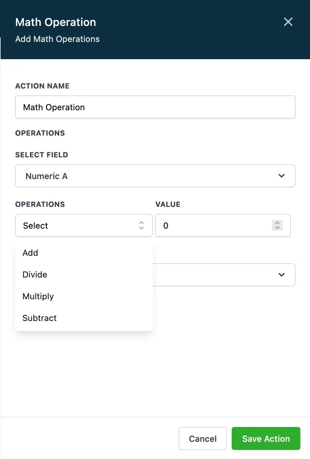 Sie können zwischen Addition, Subtraktion, Multiplikation oder Division für numerische Felder wählen.