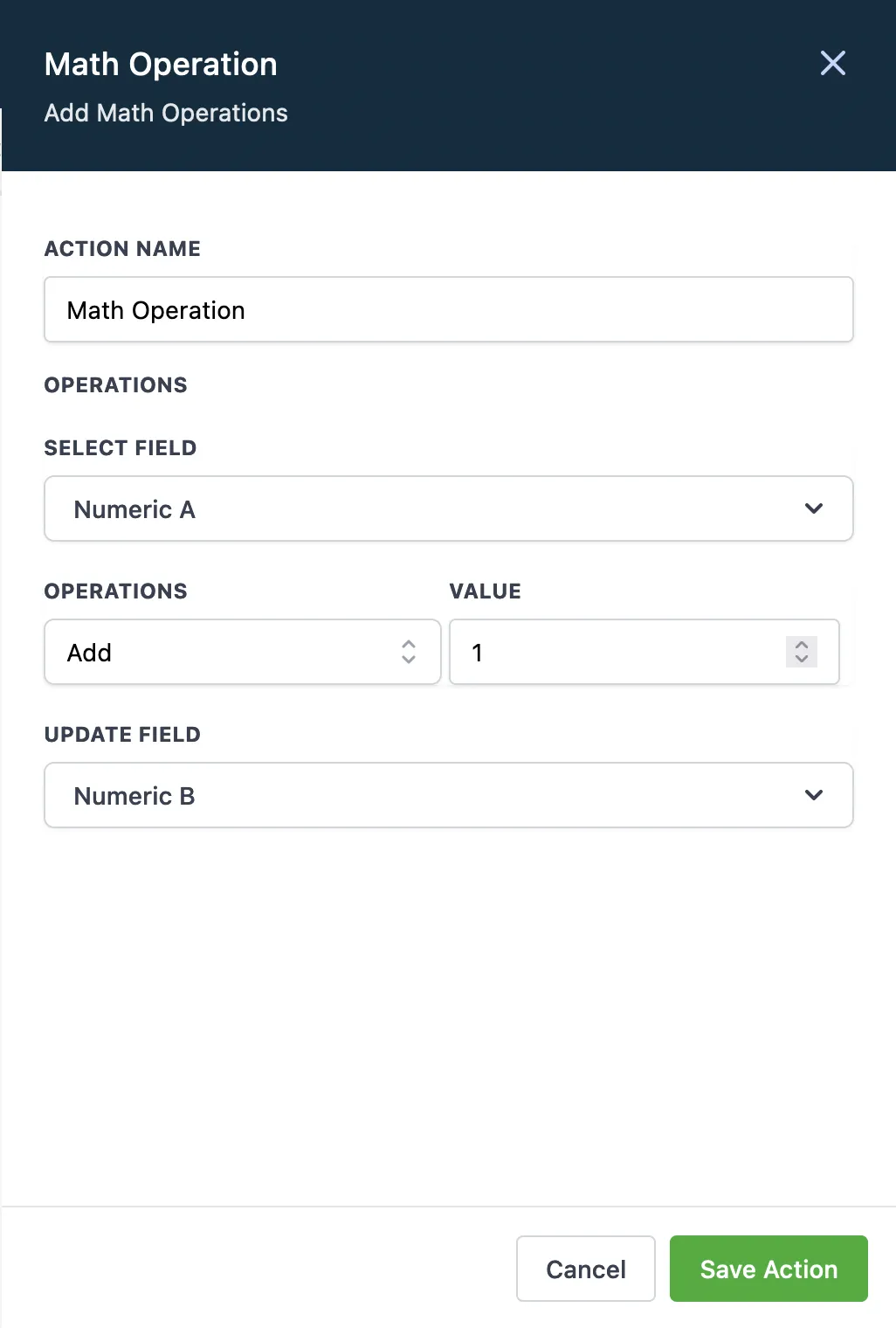 Sowohl numerische als auch monetäre Felder können in Math Operation-Aktionen innerhalb von Workflows verwendet werden, um Addition, Subtraktion, Multiplikation oder Division Berechnungen durchzuführen.