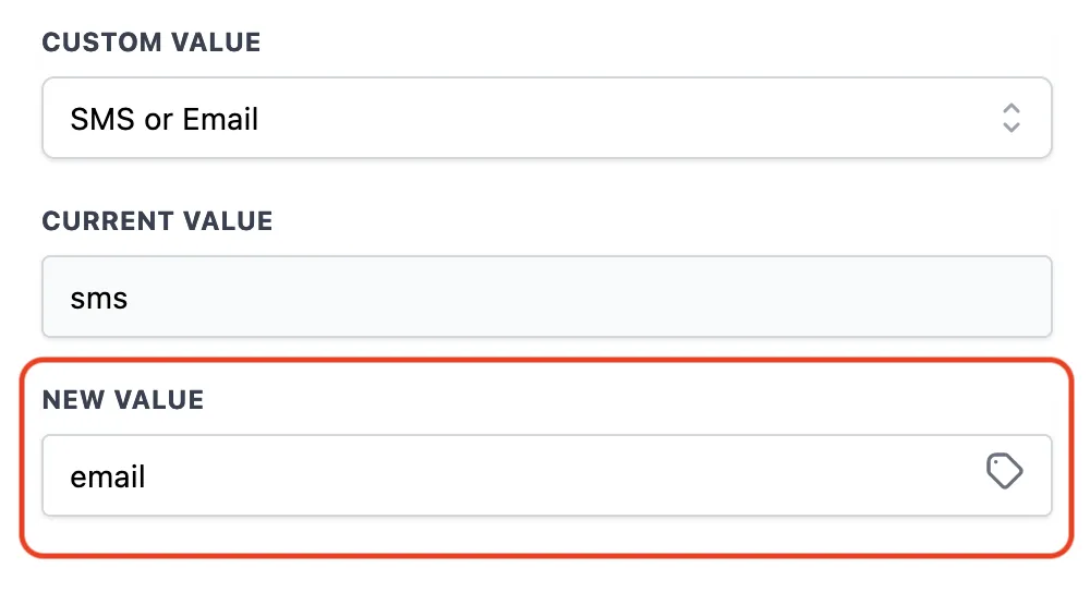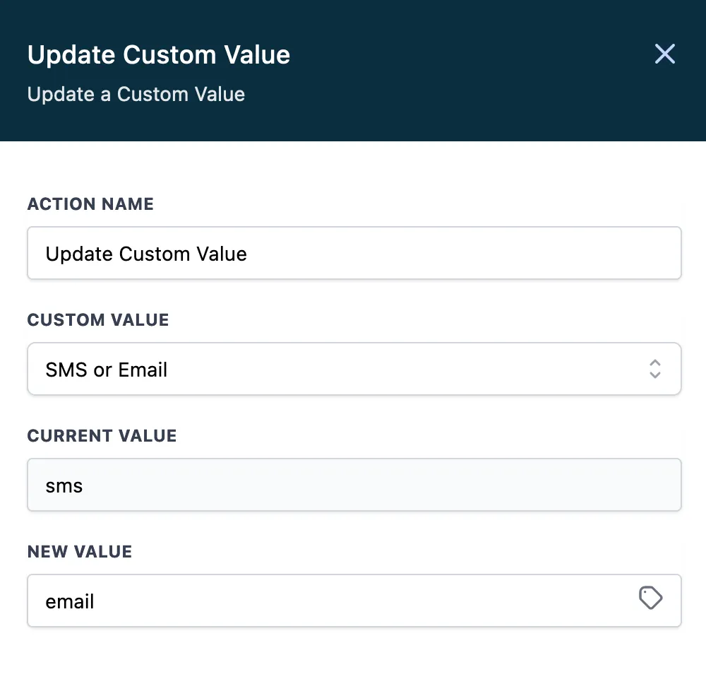 Geben Sie den neuen Wert an: Geben Sie den neuen Wert ein, auf den Sie den benutzerdefinierten Wert aktualisieren möchten. Sie können den benutzerdefinierten Wert mit einem statischen Wert, einem festen Wert, den Sie im Workflow angeben, oder einem benutzerdefinierten Wert aktualisieren, der dynamisch basierend auf anderen Daten in Ihrem Workflow generiert wird.