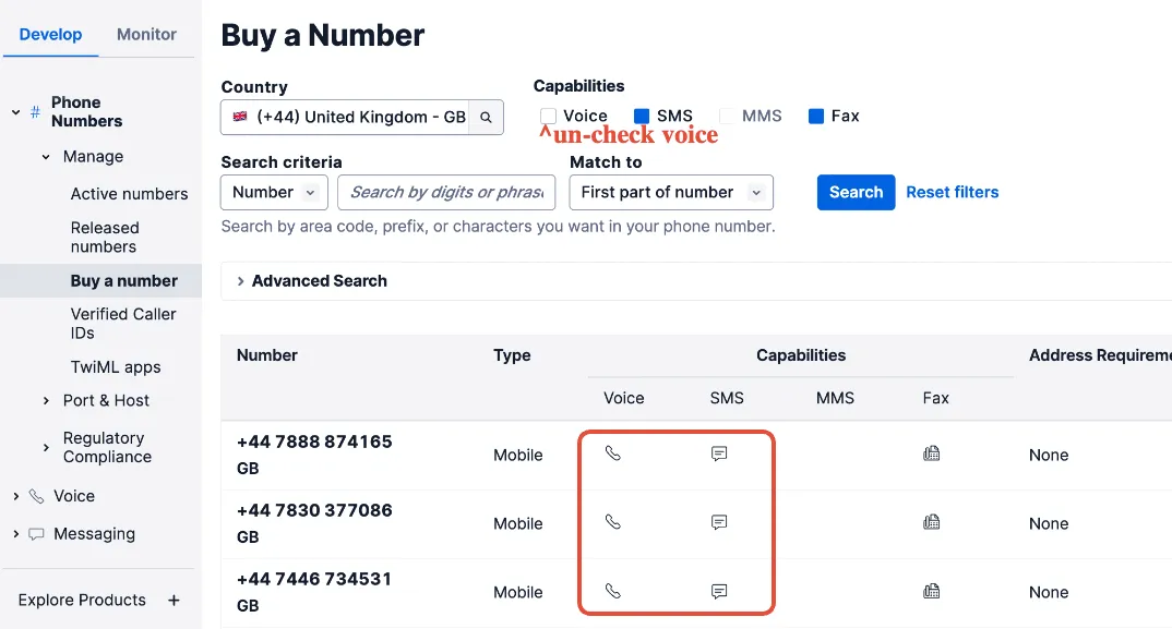 >Entwickeln > Telefonnummern > Eine Nummer kaufen > Land auf UK setzen > Sprachfunktionen deaktivieren