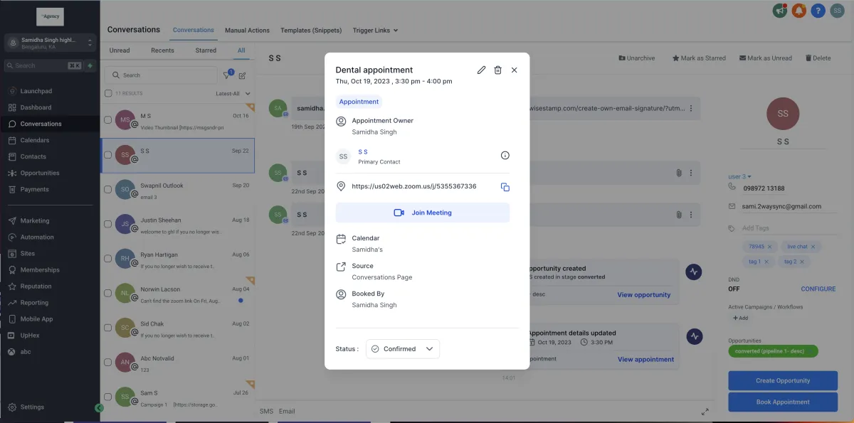 Jedes Mal, wenn ein Termin erstellt, umgeplant oder sogar abgesagt wird, finden Sie eine Aktivitätskarte im Konversationspanel. Diese Funktion ist darauf ausgelegt, Sie ständig auf dem Laufenden zu halten, ohne dass Sie zwischen mehreren Bildschirmen wechseln müssen. Durch Klicken auf "Termin anzeigen" innerhalb der Karte können Sie die Terminangaben nahtlos bearbeiten, während Sie im Konversationspanel bleiben.