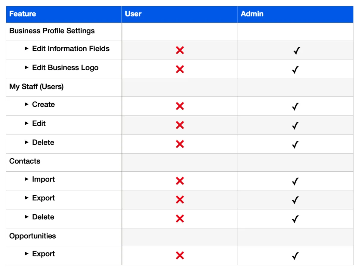 Die folgende Tabelle gibt einen Überblick über die Berechtigungen von Unterkonto-Level-Rollen.