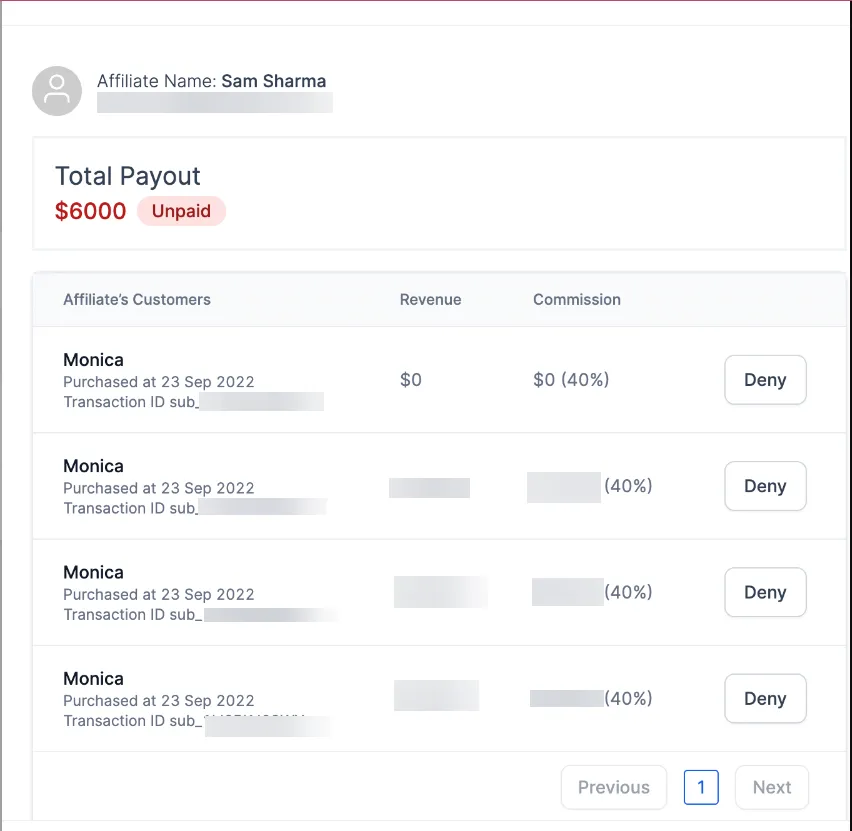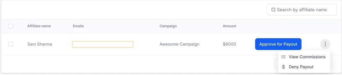 Ausstehend - Alle Auszahlungen über alle Kampagnen werden monatsweise in diesem Status erfasst. Der Affiliate-Besitzer soll hierher kommen und die Affiliates genehmigen, die für eine Auszahlung berechtigt sind. Der Affiliate-Besitzer kann die Aufschlüsselung der Auszahlung jedes Affiliates auf Kampagnen- und Monatsebene sehen, indem er auf die drei Punkte klickt.