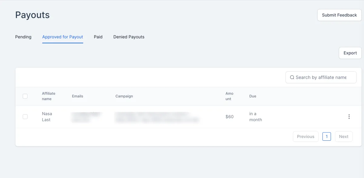 Payouts werden am 1. jedes Monats im Bereich "Auszahlungen" unter dem Tab "Ausstehend" generiert, und die Spalte "Fällig" zeigt das Datum an, an dem die Auszahlung basierend auf den Konfigurationen für das entsprechende Kampagnen-Partnerprogramm erfolgen sollte.