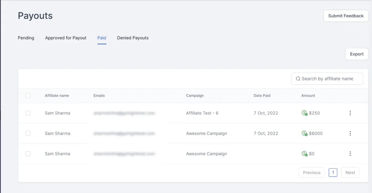 Bezahlt - Dieser Tab zeigt eine Liste aller Affiliates, die eine Auszahlung erhalten haben, zusammen mit dem Datum der Transaktion. Auszahlungen können aus diesem Status nicht verschoben werden. Dies ist der endgültige Status für den Auszahlungsvorgang.
