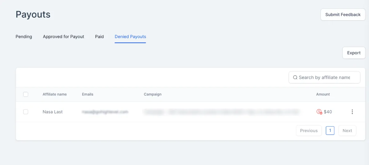 Abgelehnte Auszahlungen - Wenn eine Auszahlung für einen Affiliate abgelehnt wurde, gelangen sie zu diesem Tab. Eine Auszahlung kann über einen der folgenden Tabs abgelehnt werden: Ausstehend, Genehmigt für Auszahlung