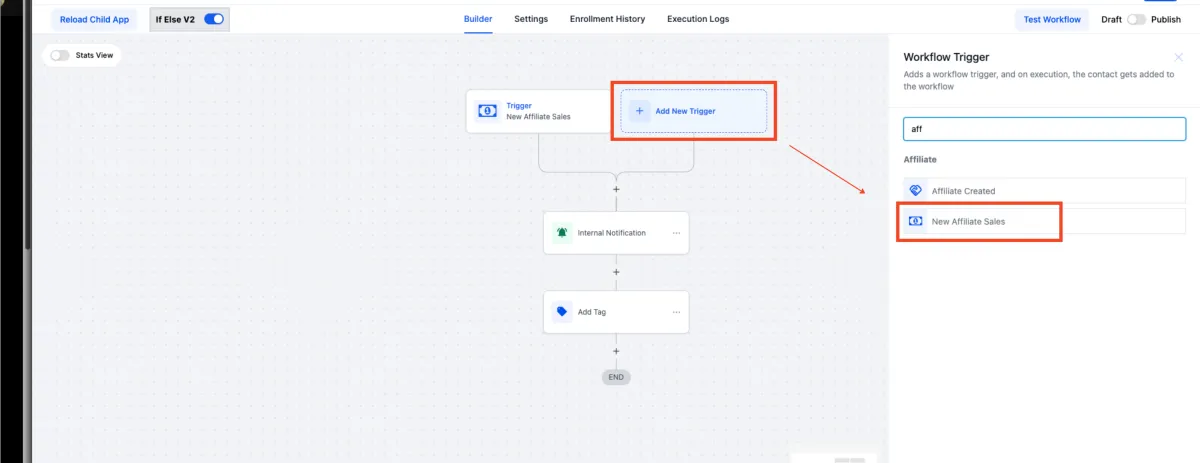 3. Fügen Sie den Auslöser mit "Affiliate-Verkäufe hinzufügen" hinzu.