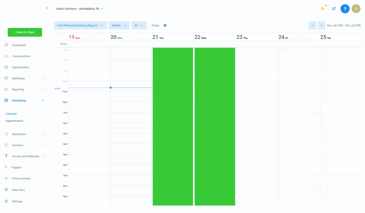 Um einen bestimmten Tag in einem Kalender zu blockieren, gehen Sie zu Planung > Kalender, klicken Sie auf den "Ganztägig" Block oben auf dem Datum, das Sie blockieren möchten, und dann klicken Sie auf "Schließen".