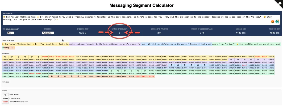 Die Reduzierung der Anzahl von Segmenten in Ihrer SMS kann die SMS-Kosten senken.. Um dies zu tun, öffnen Sie den Segmentrechner und fügen Sie Ihre Nachricht ein. Arbeiten Sie daran, die "Anzahl der Segmente" auf niedrigere Zahlen zu reduzieren, um die Gesamtkosten zu senken.