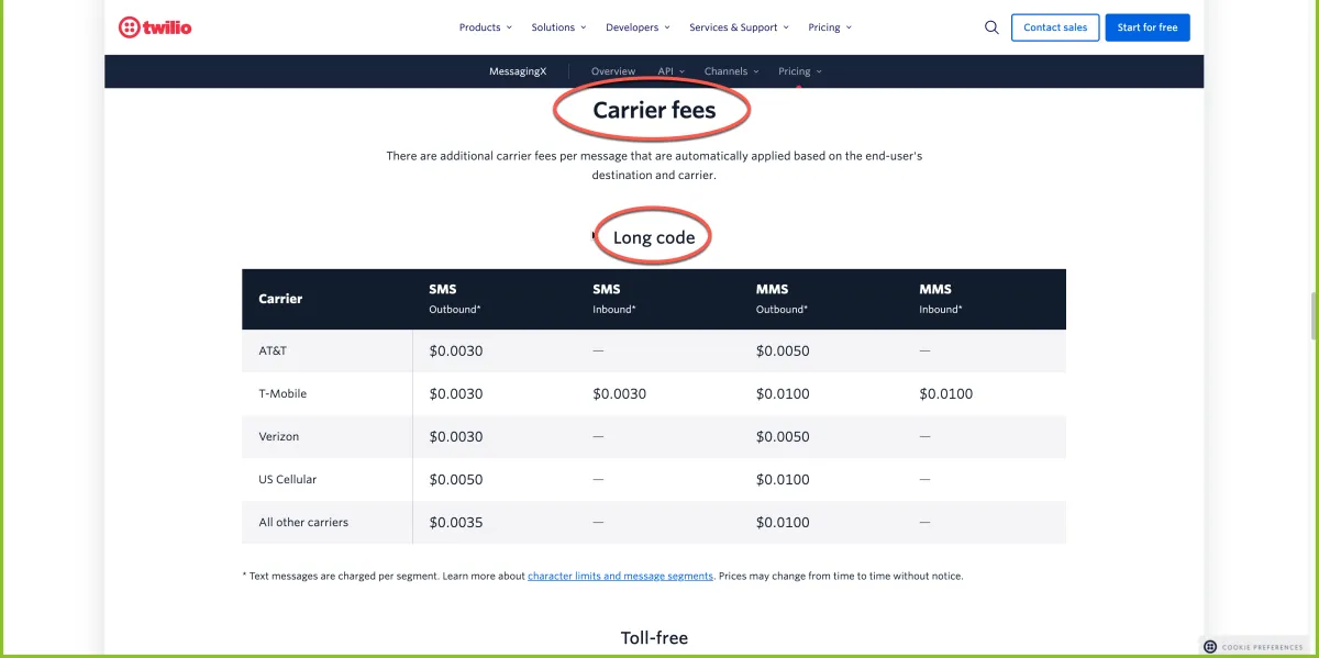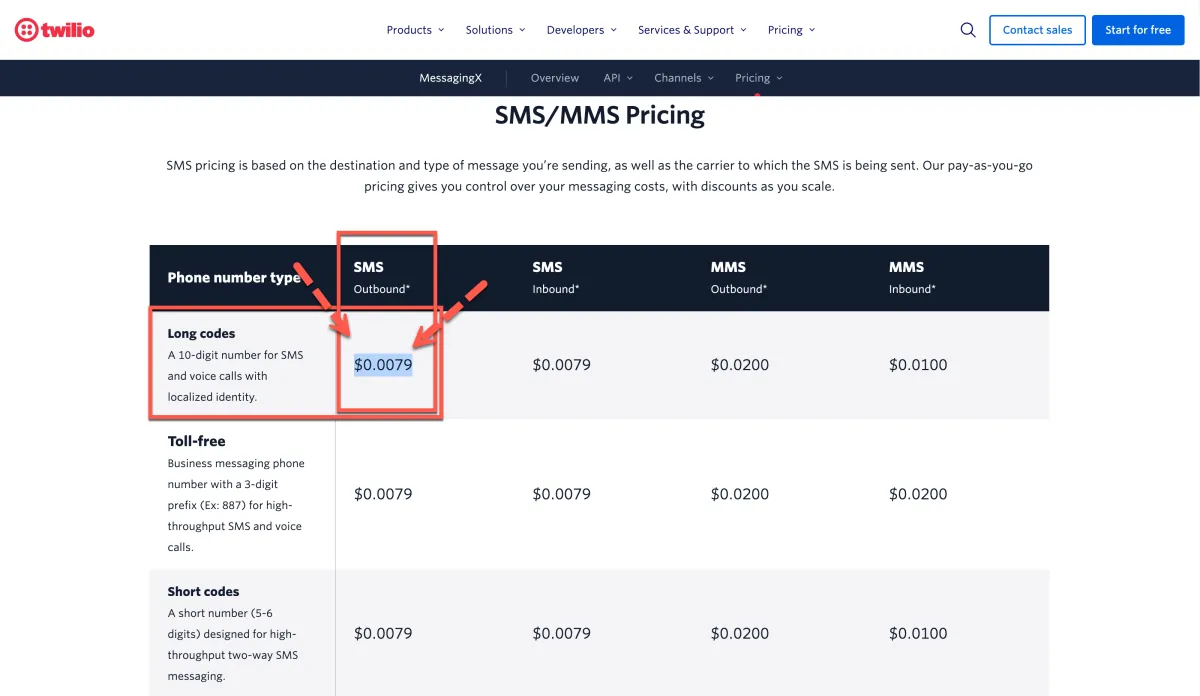 Then scroll down to "SMS/MMS Pricing." Locate your "Per-Segment Costs". In our example, we are sending an outbound SMS for long codes. So we choose $0.0079 for this example.