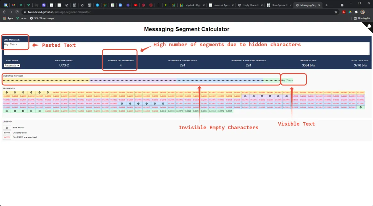 Viele Pilotly en kopieren/ fügen den SMS-Textkörper beim Entwerfen der Automatisierung ein. Wenn Sie Text aus einer Textverarbeitungssoftware wie MS Word oder Google Docs kopieren/fügen, werden manchmal versteckte Zeichen an den String angehängt. Diese versteckten Zeichen sind für den Benutzer nicht sichtbar, aber sie sind im Text enthalten.