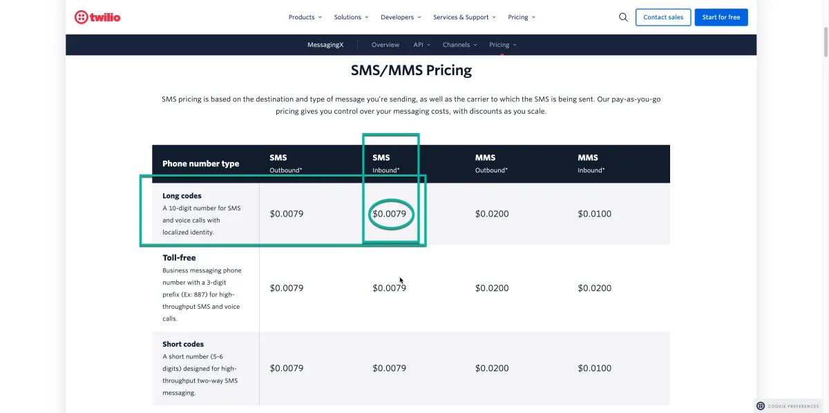 Zum Beispiel öffnen Sie die SMS-Preise Gehe auf die Seite und suche die "Eingehend" Spalte, um die Preise für eine bestimmte eingehende Nachricht zu sehen. Dies zeigt die Kosten für den Eingang einer SMS für eine Long Code (10-stellige) Nummer an.