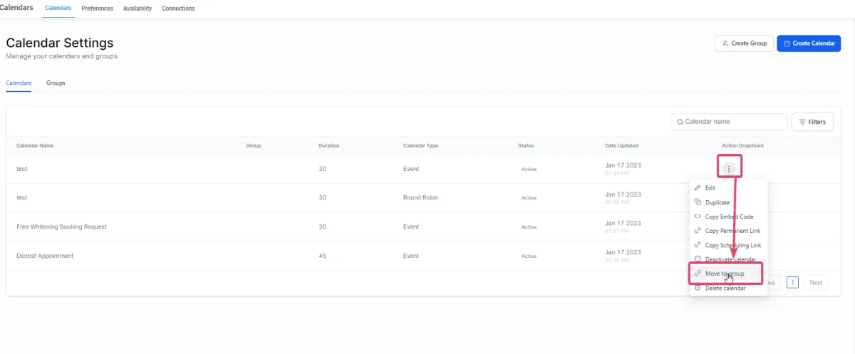 Klicken Sie auf die 3 Punkte auf der rechten Seite des gewünschten Kalenders und dann auf "In Gruppe verschieben":