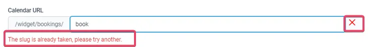 In einigen Fällen sehen Sie möglicherweise ein "Kreuz", was bedeutet, dass die benutzerdefinierte Kalender-URL in diesem Fall nicht verfügbar ist. Sie können dann Ihre benutzerdefinierte Kalender-URL anpassen/ändern, um sicherzustellen, dass sie eindeutig ist und Sie sie erhalten. URL
