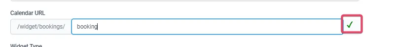 Sobald Sie die benutzerdefinierte URL eingegeben haben, führt das System eine Verfügbarkeitsprüfung der benutzerdefinierten Kalender-URL durch.Sie können dann entweder ein "Häkchen" sehen, das anzeigt, dass es für Sie verfügbar ist und gespeichert werden kann.