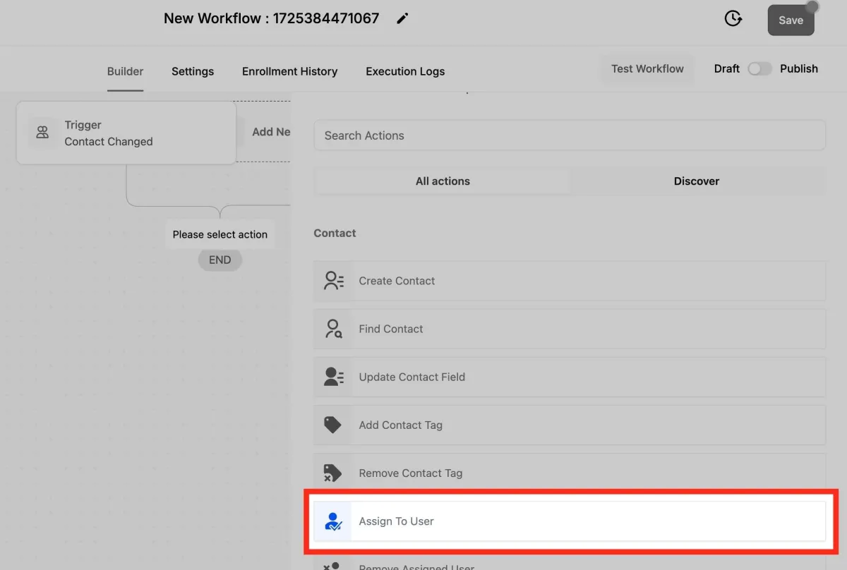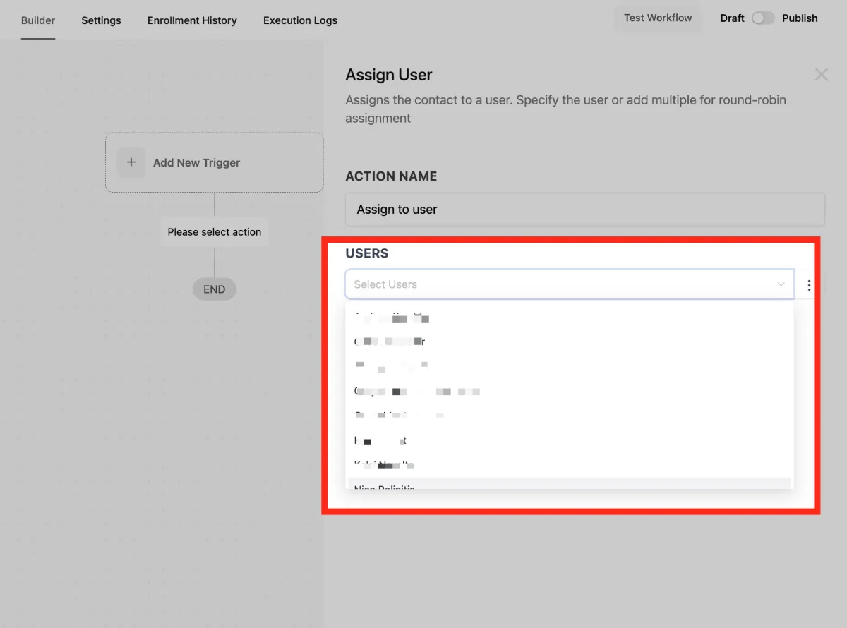 Im vorherigen Schritt wählen wir das Teammitglied aus, dem automatisch alle neuen Kontakte zugewiesen werden, die in diesen Workflow eintreten.
