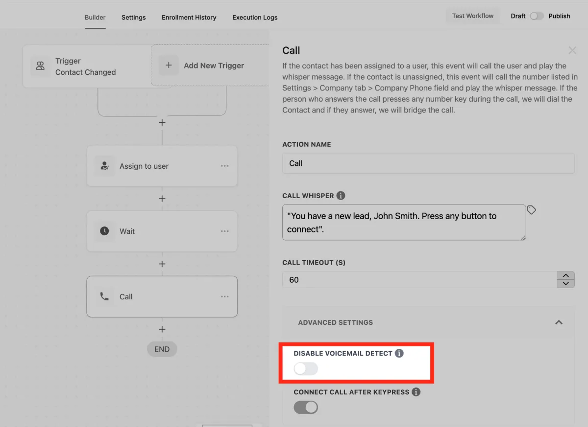 Um mit unserem Anrufereignis eine personalisierte Voicemail zu hinterlassen, gehen Sie zu den Einstellungen des Anrufschritts und aktivieren Sie „ Voicemail-Erkennung deaktivieren“.