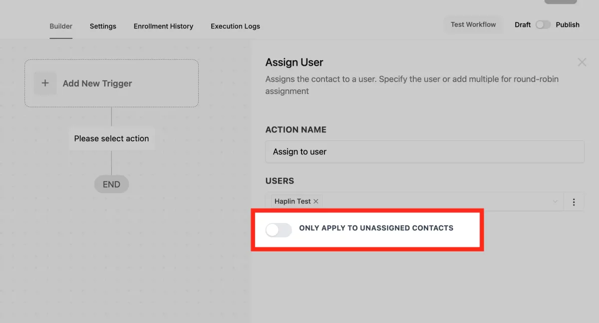 Mit dieser Umschaltoption können Sie nun entscheiden, ob Sie die neu hinzugefügten Kontakte demselben Benutzer zuweisen möchten, auch wenn der Kontakt bereits einem Teammitglied zugewiesen war, bevor er in diesen Workflow eintrat, oder ob Sie die Zuweisung solcher Kontakte beenden möchten.