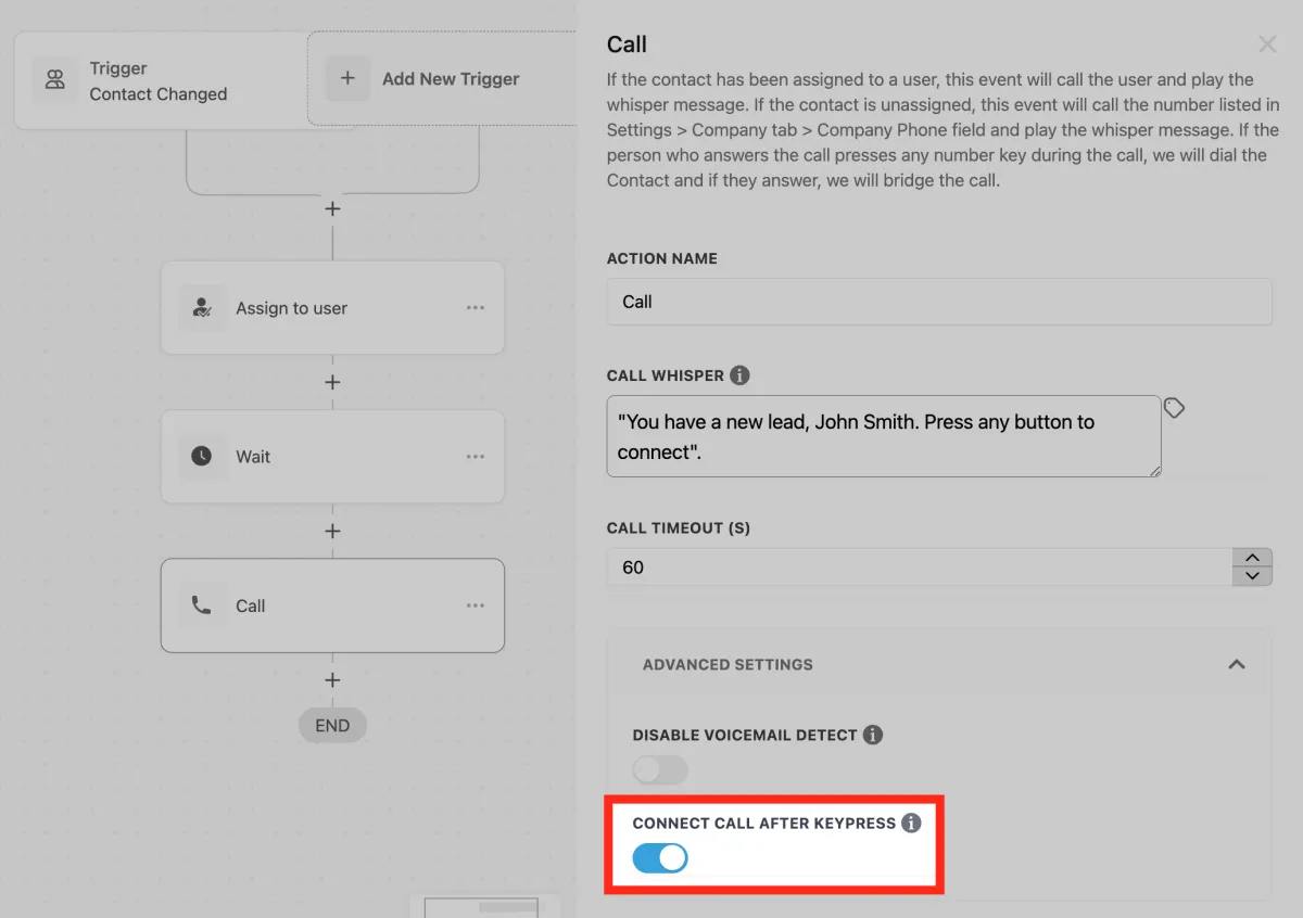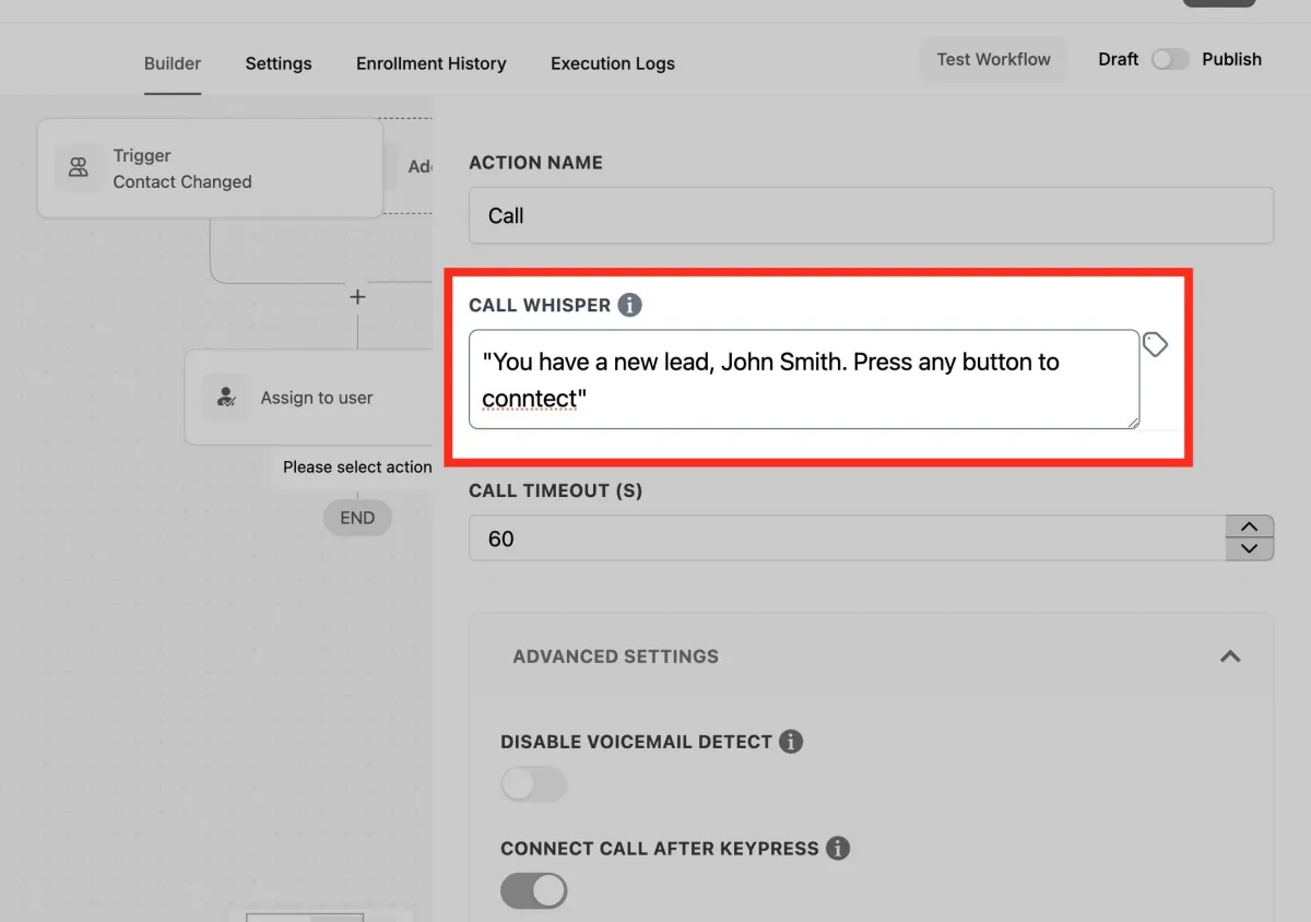 Standardmäßig lautet die Anruf-Whispernachricht: „Sie haben einen neuen Lead, John Smith. Drücken Sie eine beliebige Taste, um eine Verbindung herzustellen.“