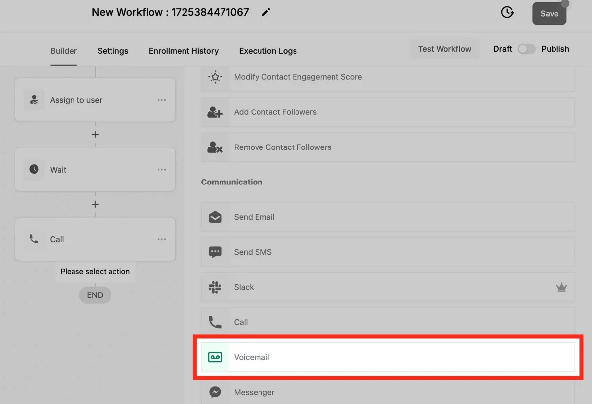 Sehen wir uns nun an, wie Sie die Aktion „Voicemail“ hinzufügen. Verwenden Sie dazu dieselbe Schaltfläche „+“, um eine neue Workflow-Aktion hinzuzufügen. Sobald die Seite mit allen Workflow-Aktionen angezeigt wird, scrollen Sie nach unten, um die Option „Voicemail“ zu finden, und klicken Sie darauf, um fortzufahren.