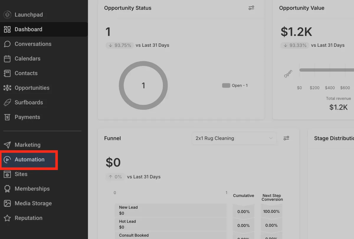 Sobald Sie sich im Unterkonto befinden, klicken Sie im Navigationsmenü auf der linken Seite auf „ Automatisierung“ .