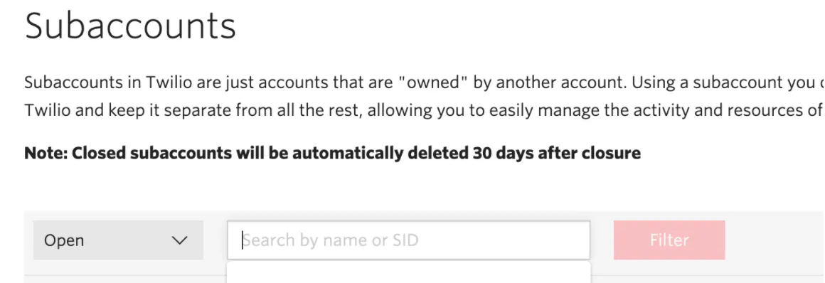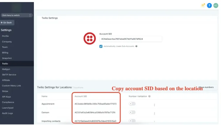 2. Wenn es zu viele Unterkonten in Twilio gibt, können Sie zu Pilotly zurückkehren und die Account SIN für diesen Standort kopieren, um in Twilio zu suchen: https://my.pilotly.io/settings/twilio