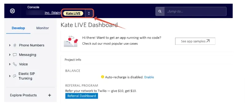 1. Gehen Sie auf das Konto-Dropdown-Menü oben rechts und klicken Sie auf Unterkontenhttps://console.twilio.com/