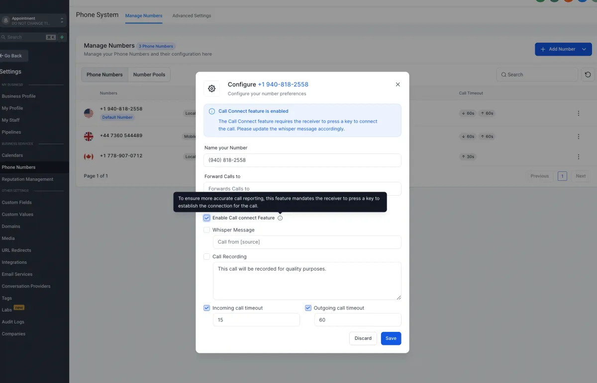 Diese Funktion erfordert, dass der Empfänger eine Taste drückt, um den Anruf zu verbinden. Dadurch wird die Genauigkeit der Anrufprotokollierung erhöht. Nachdem Sie diese Option aktiviert haben, müssen Sie die Flüster-Nachricht aktualisieren, da diese Funktion erfordert, dass der Empfänger eine Taste drückt, um den Anruf zu verbinden.