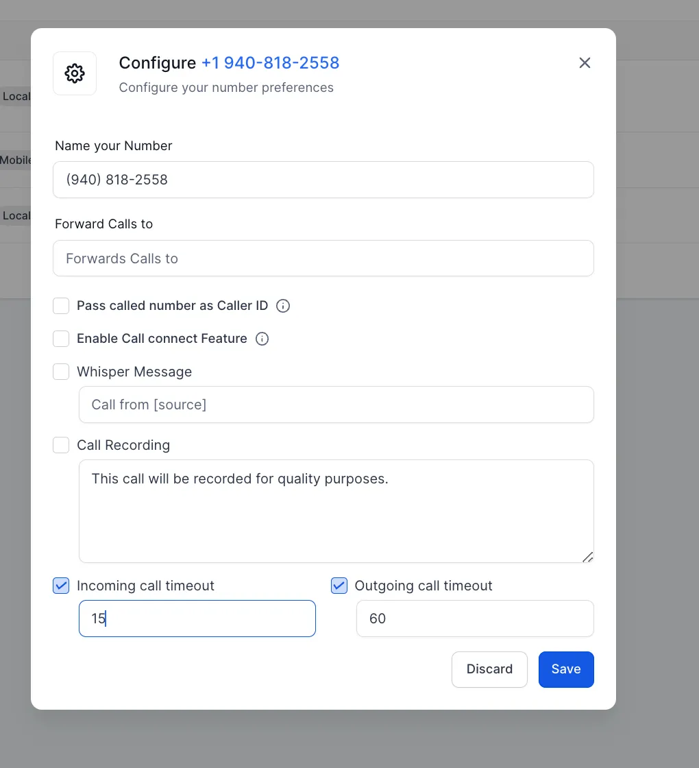 Zum Beispiel, wenn Ihre Weiterleitungsnummer innerhalb von 15 Sekunden die Voicemail abnimmt, stellen Sie die Anrufzeitüberschreitung auf 10 Sekunden ein, damit die Weiterleitung den Anruf vor Erreichen Ihrer Voicemail abbricht. Dadurch wird der Anruf als beantwortet markiert, da wir nicht wissen können, ob es sich um einen Menschen oder eine Voicemail handelt, die den Anruf entgegennimmt.
