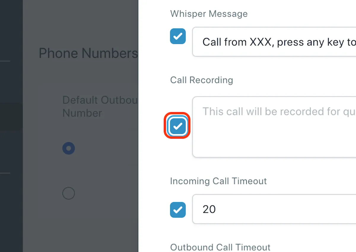 Aktivieren Sie das Kontrollkästchen für die Anrufaufzeichnung (Standardnachricht: Dieser Anruf wird zur Qualitätssicherung aufgezeichnet)