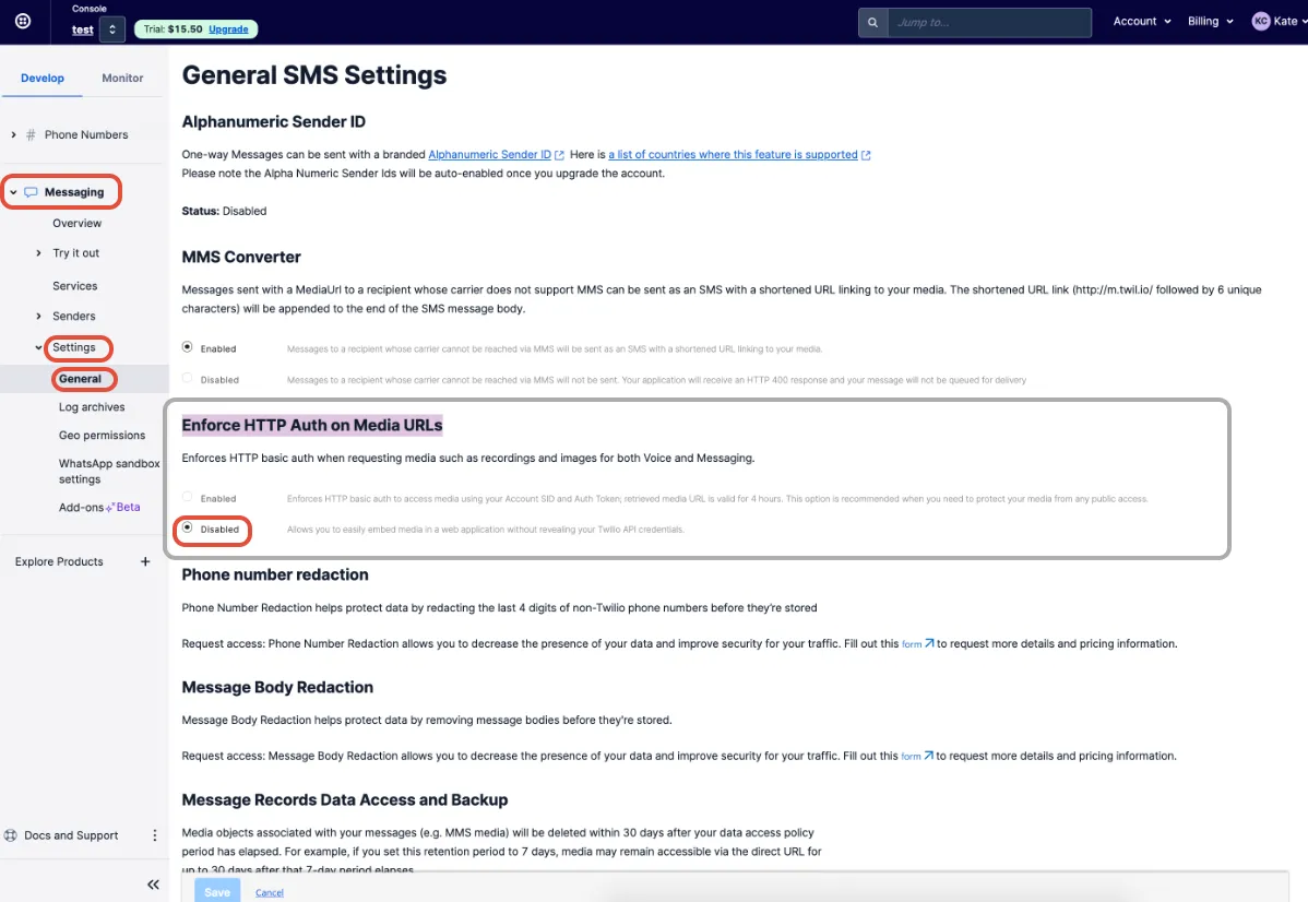 Greifen Sie auf die Seite "Allgemeine SMS-Einstellungen" in der Twilio-Konsole zu. Scrollen Sie zum Abschnitt "HTTP-Authentifizierung für Medien-URLs erzwingen" und wählen Sie dann Aktivieren. Klicken Sie auf Speichern.