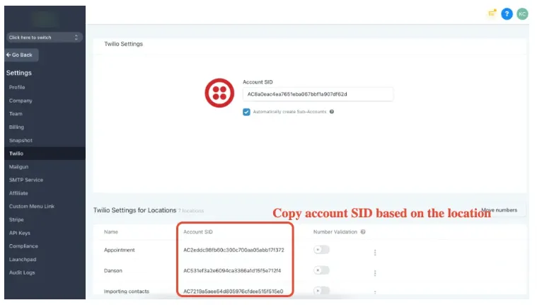 Wenn es zu viele Unteraccounts in Twilio gibt, können Sie zu HL zurückkehren und die Account SIN für diesen Standort kopieren, um in Twilio zu suchen: