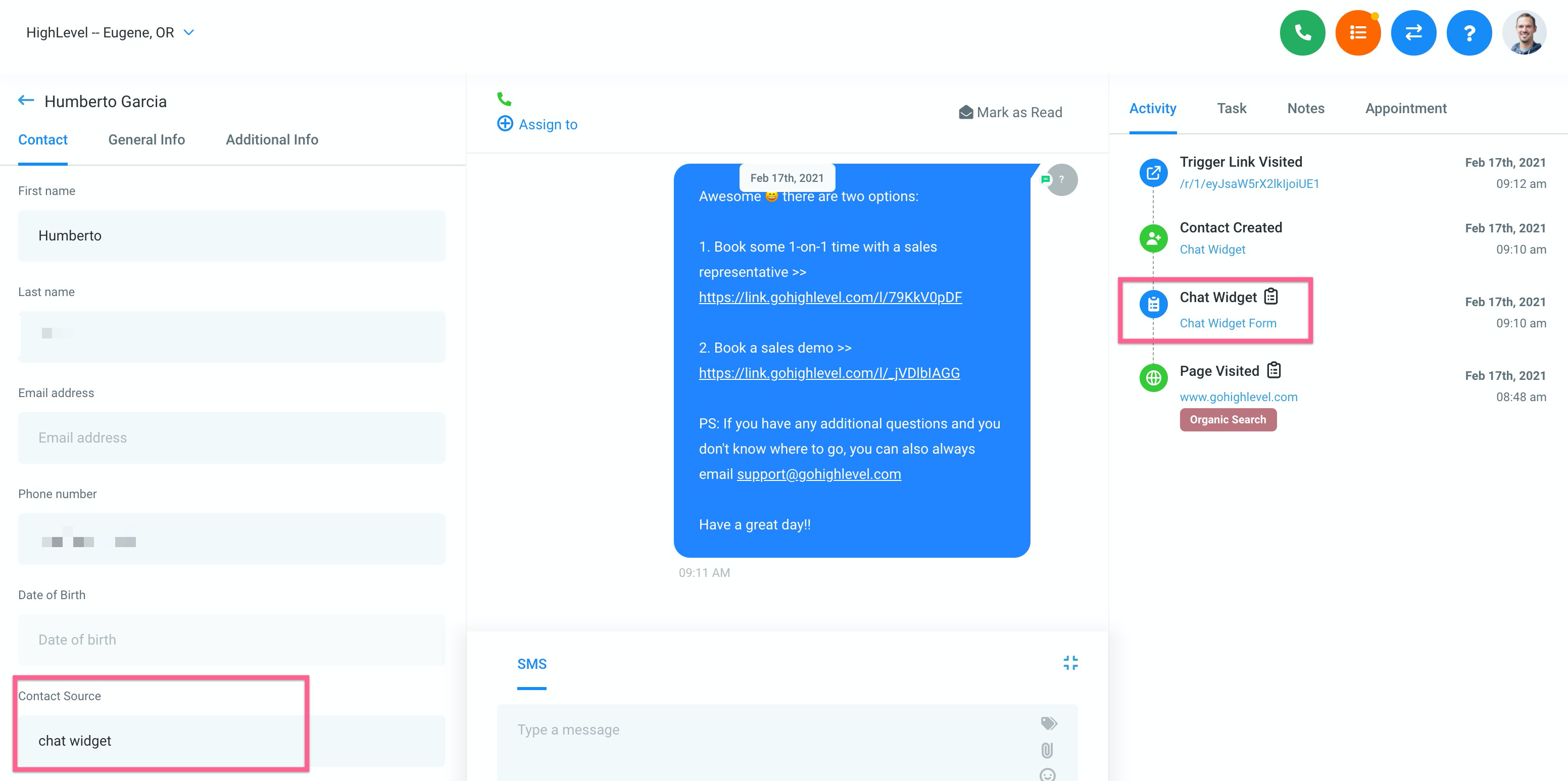 Wenn ein Kontakt über ein Live-Chat-Widget ein Gespräch startet, wird dieses Ereignis auf der Aktivitäten-Registerkarte auf der Kontakt-Detailseite in Kontakte angezeigt.