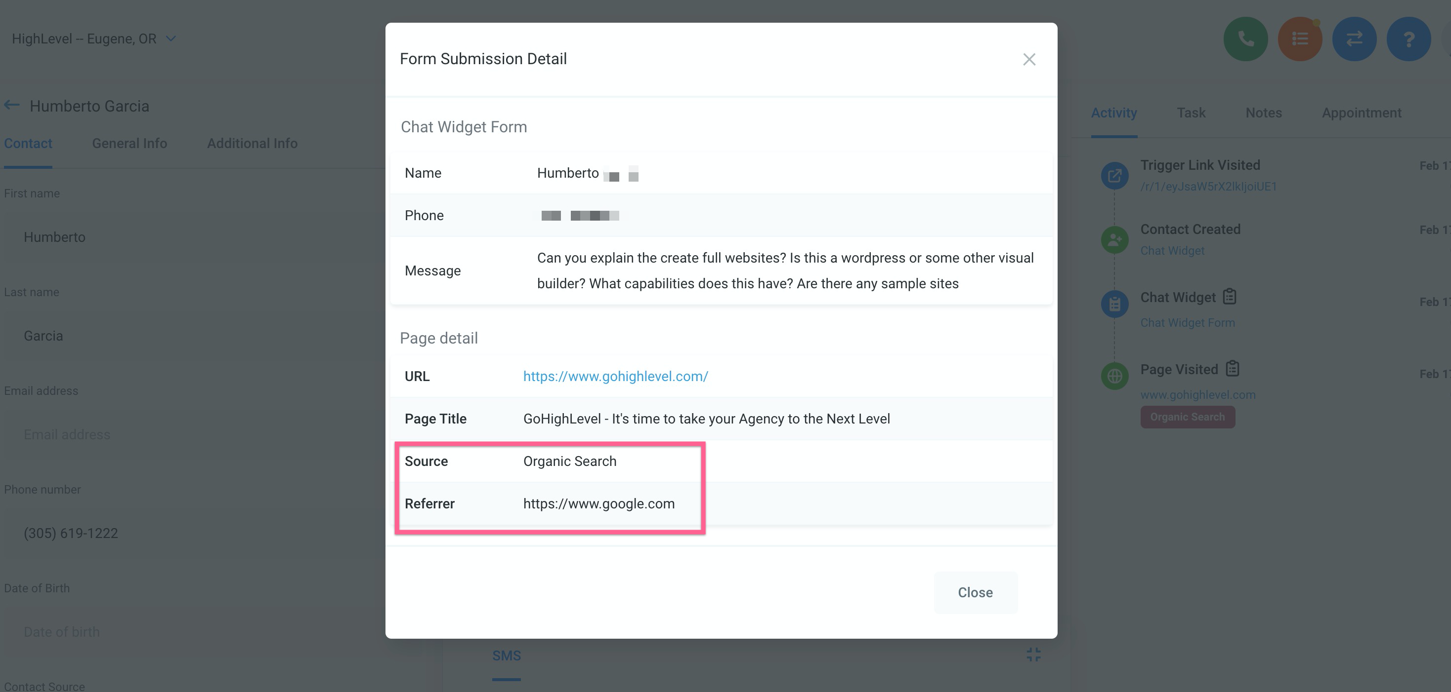 Durch Klicken auf das Zwischenablage-Symbol wird das Formular für die Einreichung geöffnet (also die ursprüngliche Nachricht, die sie in das Chat-Widget eingegeben haben), wo Sie weitere Informationen einsehen können, einschließlich der Quelle (organische Suche, Direktverkehr usw.).