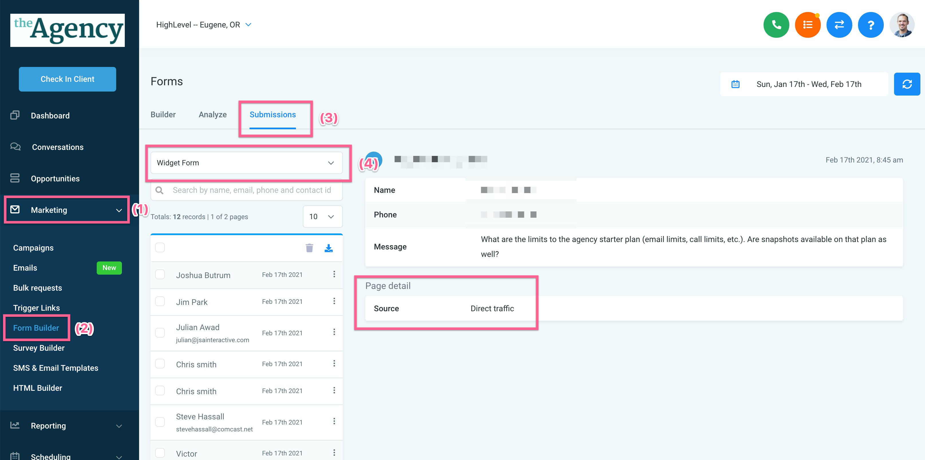 Sie können auch die Traffic-Quelle für Gespräche, die über das Live-Chat-Widget gestartet wurden, einsehen, indem Sie zu Marketing > Formular-Builder > Einsendungen gehen und dann "Widget-Formular" im Abschnitt Chat-Widget des Formularauswahl-Dropdown-Menüs auswählen.
