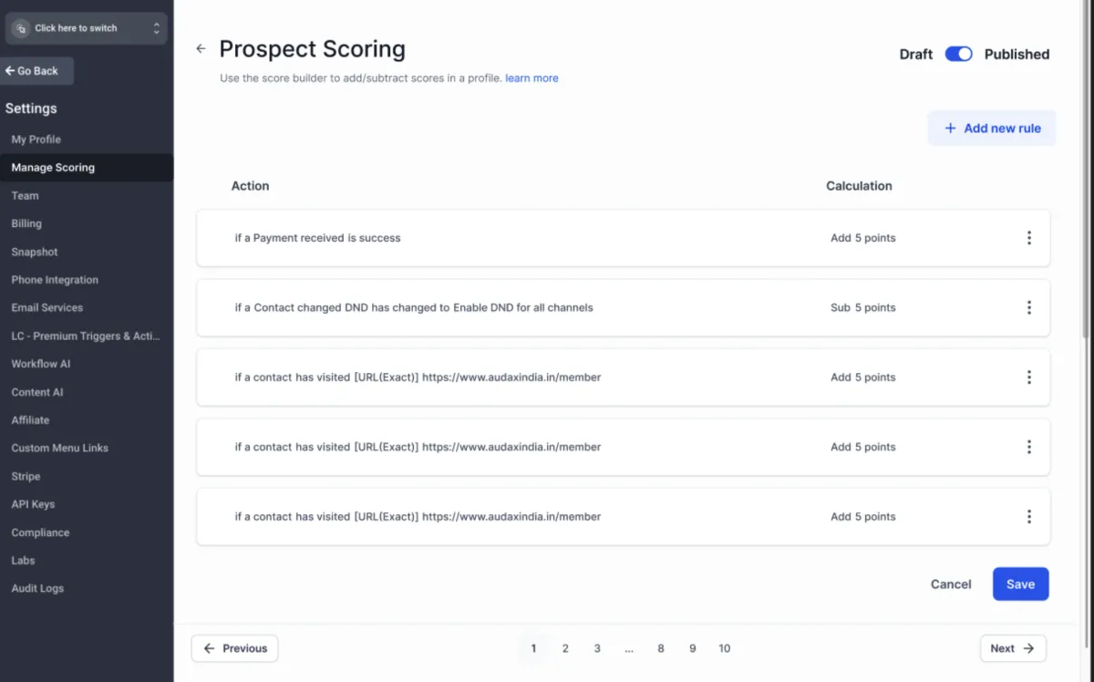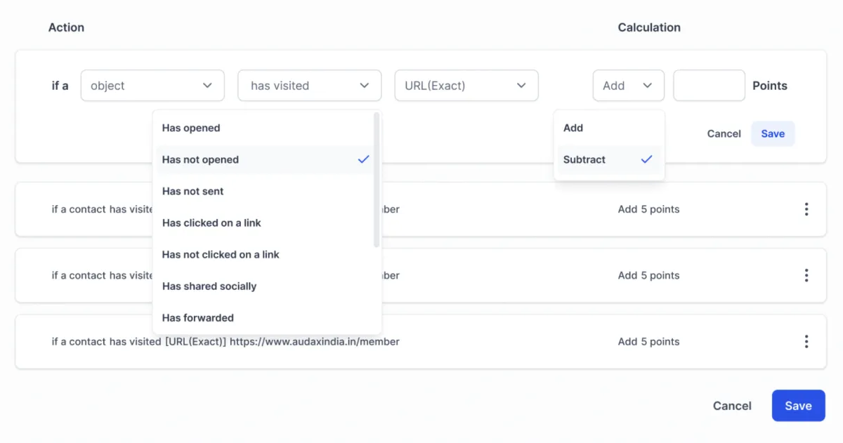 Punkte addieren oder subtrahieren: Sie haben die volle Kontrolle über die Punktevergaberegeln. Mit dem Score Builder können Sie Regeln erstellen, um Punkte basierend auf spezifischen Kriterien wie Engagement, Verhalten oder anderen relevanten Faktoren zu addieren oder zu subtrahieren.