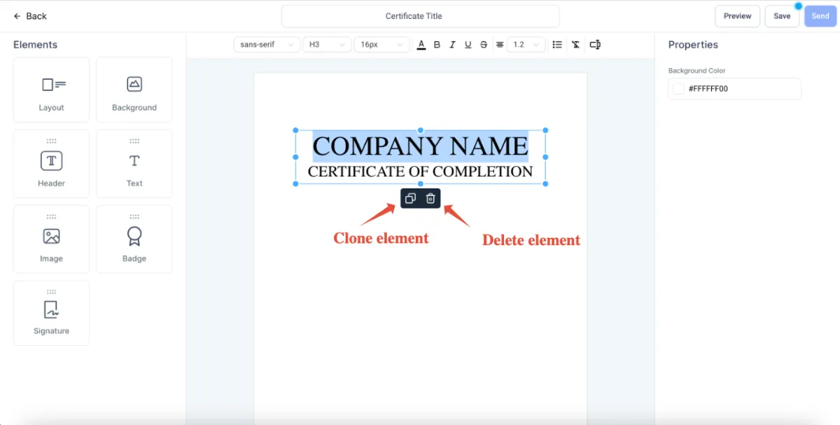 >Elemente können durch Klicken auf die Symbole für Kopieren und Löschen geklont oder gelöscht werden
