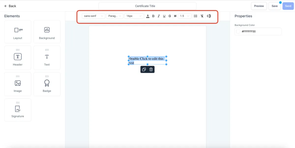 >Um einen Text hinzuzufügen, ziehen Sie das Textelement auf Ihre Vorlage und beginnen Sie mit der Bearbeitung des Textes nach der Auswahl