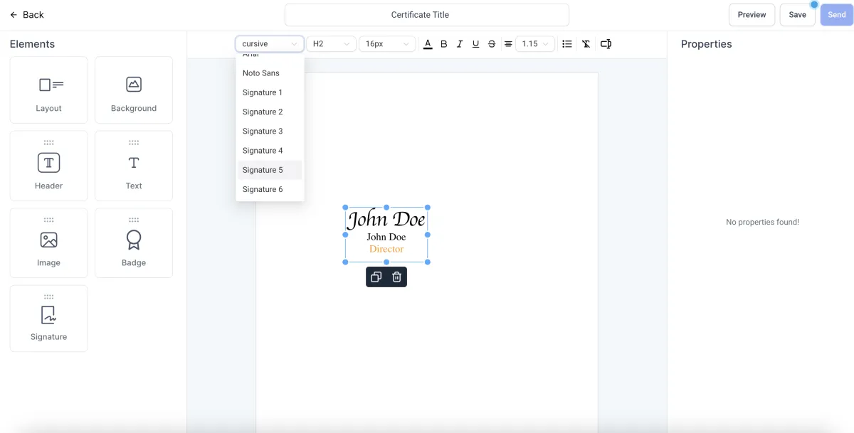 >Um eine Unterschrift hinzuzufügen, ziehen Sie das Unterschriftselement auf Ihre Vorlage