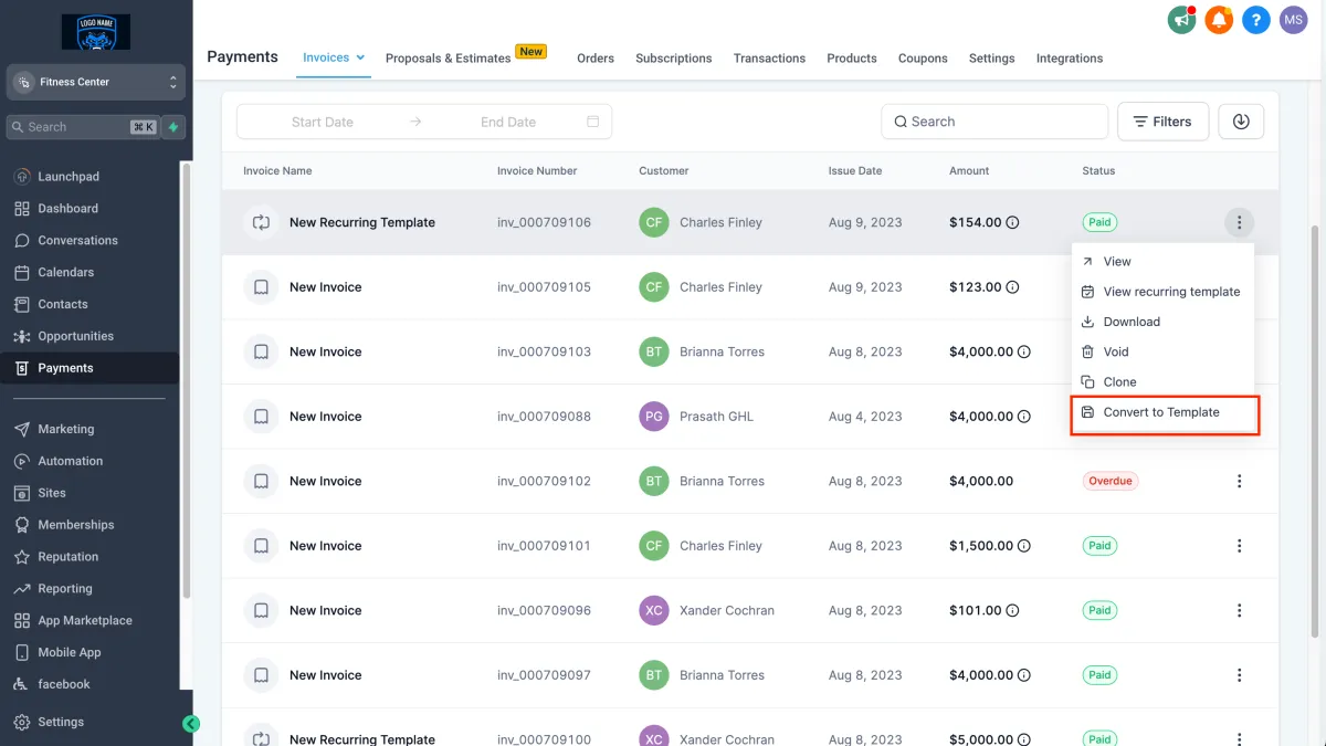 > Alle Vorlagen werden auf der Seite "Vorlagen" im Bereich "Rechnungsstellung" aufgelistet. Schnellaktionen auf der Vorlagenseite ermöglichen die Verwendung der Vorlage als einmalige Rechnung oder als wiederkehrende Rechnung.