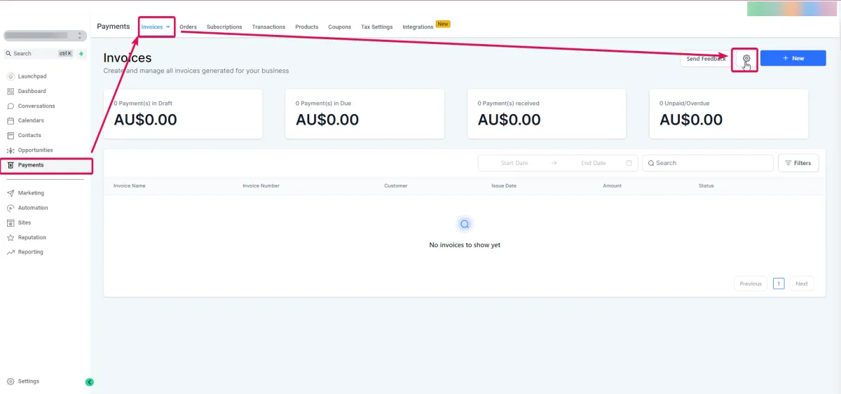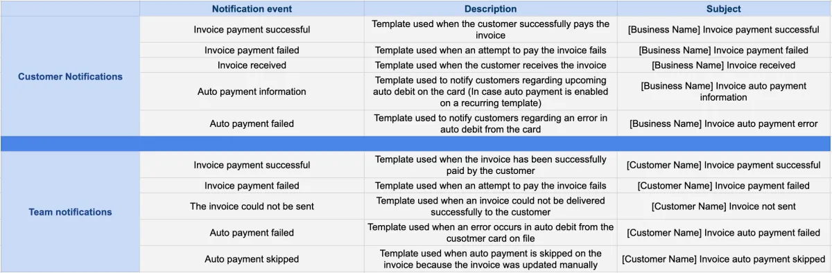 Navigieren Sie zu Zahlungen>Rechnungen>Zahnradsymbol>Wählen Sie Vorlagen für jeden Benachrichtigungstyp.