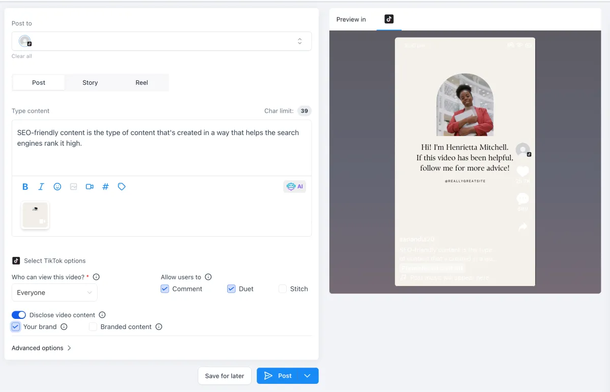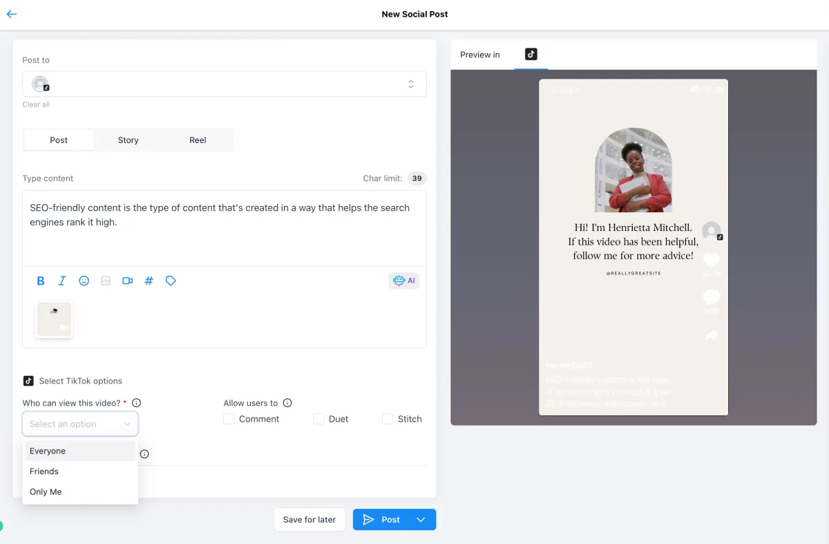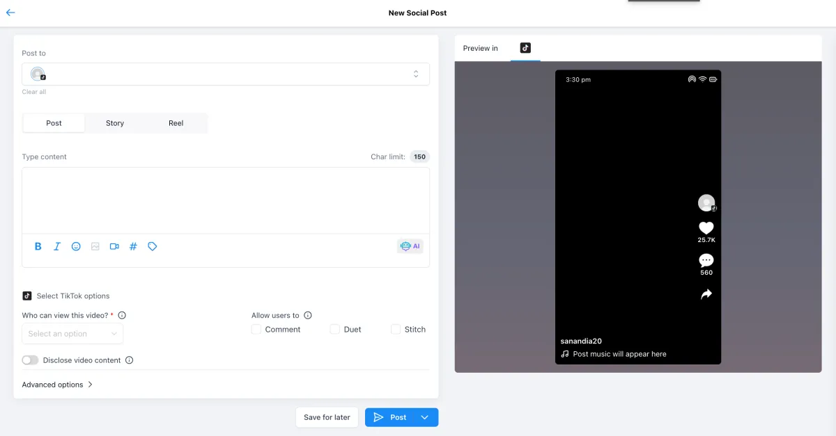 2. Im Social Planner erstelle einen neuen Beitrag, indem du das persönliche oder geschäftliche Tiktok-Konto auswählst