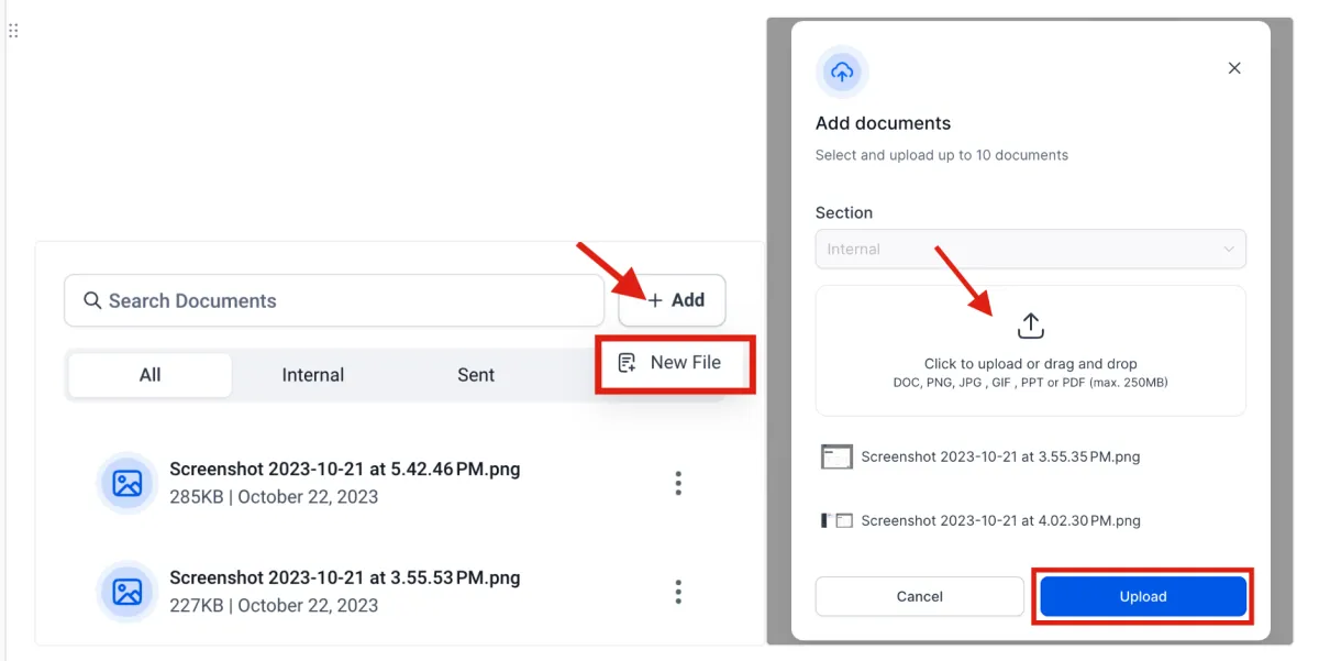 Fügen Sie neue Dokumente zum internen Bereich hinzu, indem Sie auf "+Hinzufügen" -> "Neue Datei" klicken.