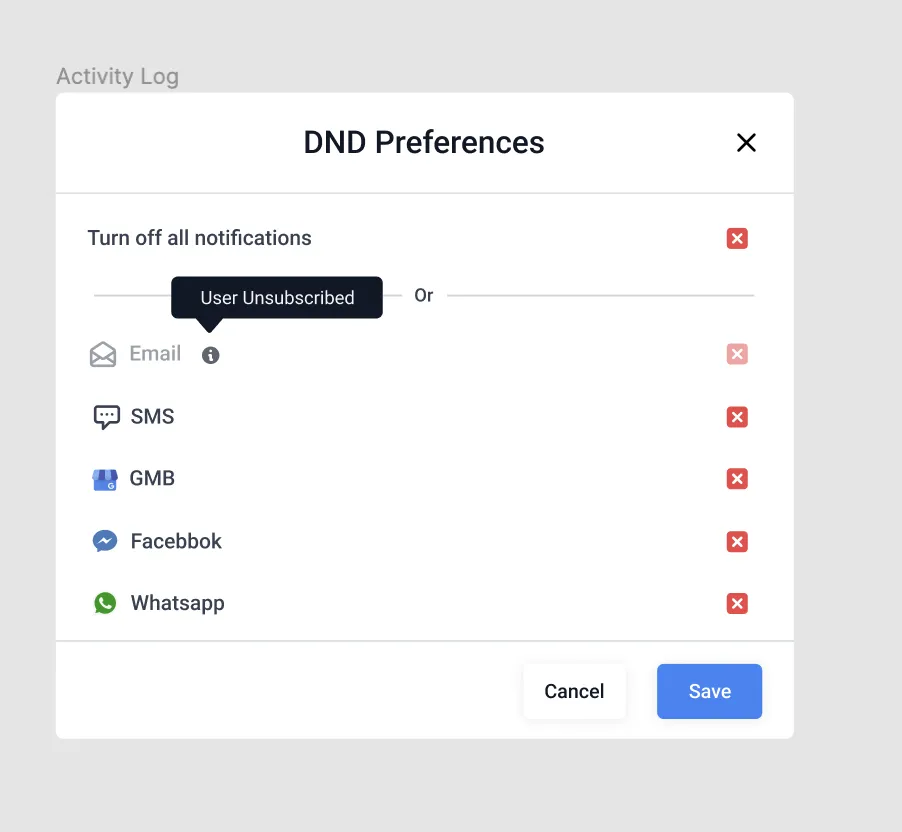 DND kann jetzt für einzelne Kanäle (FB, SMS, Anrufe, E-Mails, GMB, WhatsApp) eingestellt werden, sobald sie in das System integriert sind.