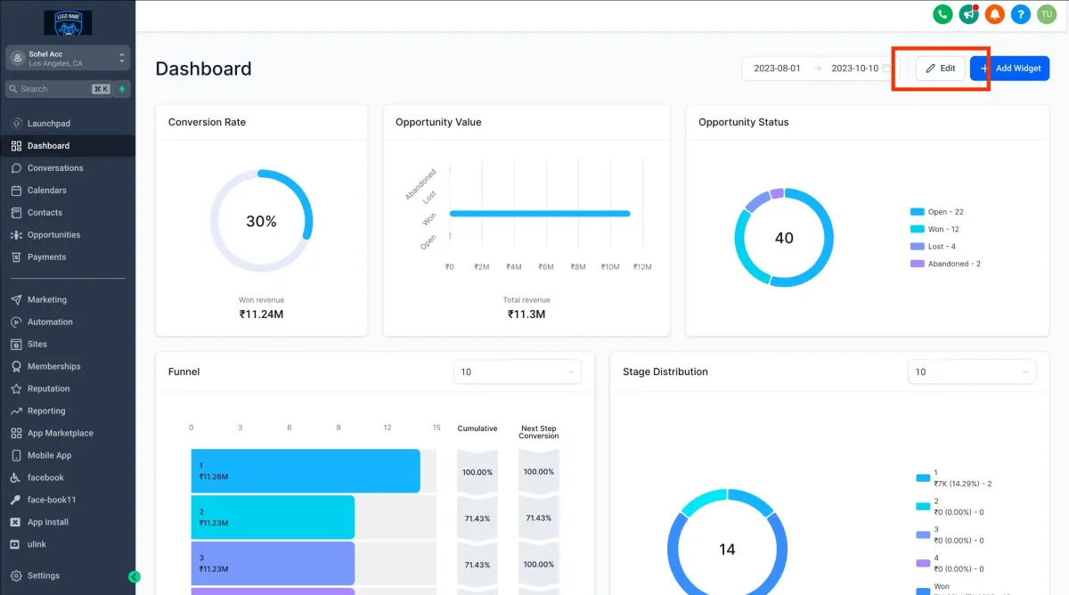 >Um ein Widget zu bearbeiten, suchen Sie das Drei-Punkte-Menü in der oberen rechten Ecke des Widgets, das Sie bearbeiten möchten. Klicken Sie darauf und wählen Sie aus dem Dropdown-Menü "Bearbeiten" aus.